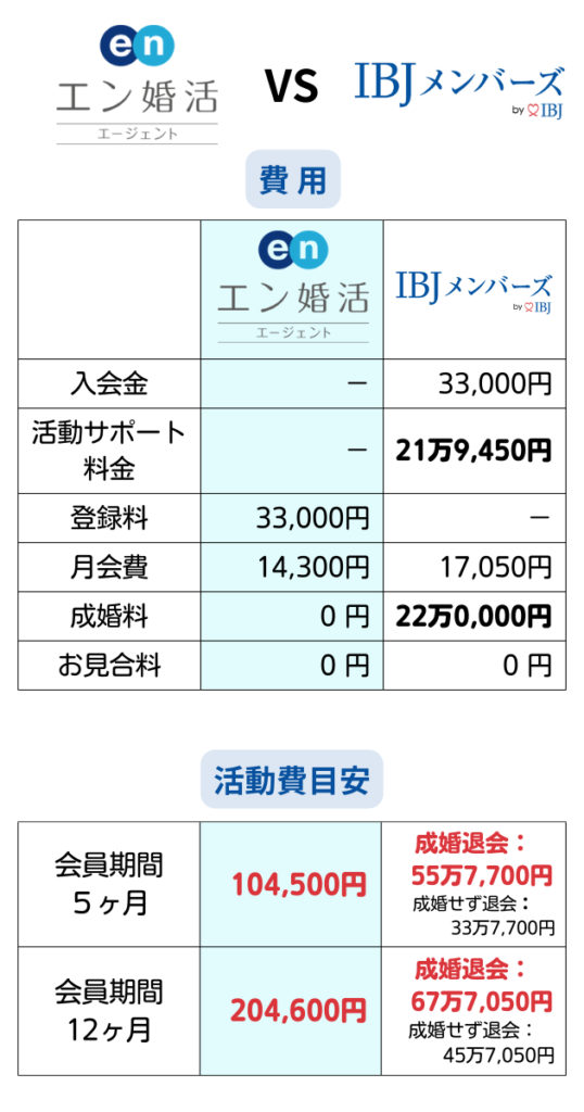 まず「IBJメンバーズ」と「エン婚活エージェント」の料金比較表を作成してみたのでご覧ください。